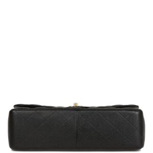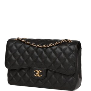 This Jumbo Classic Double Flap bag is in black caviar leather with gold tone hardware and features a front flap with signature CC turnlock closure, half moon back pocket, and adjustable interwoven gold tone chain link and black leather shoulder strap.