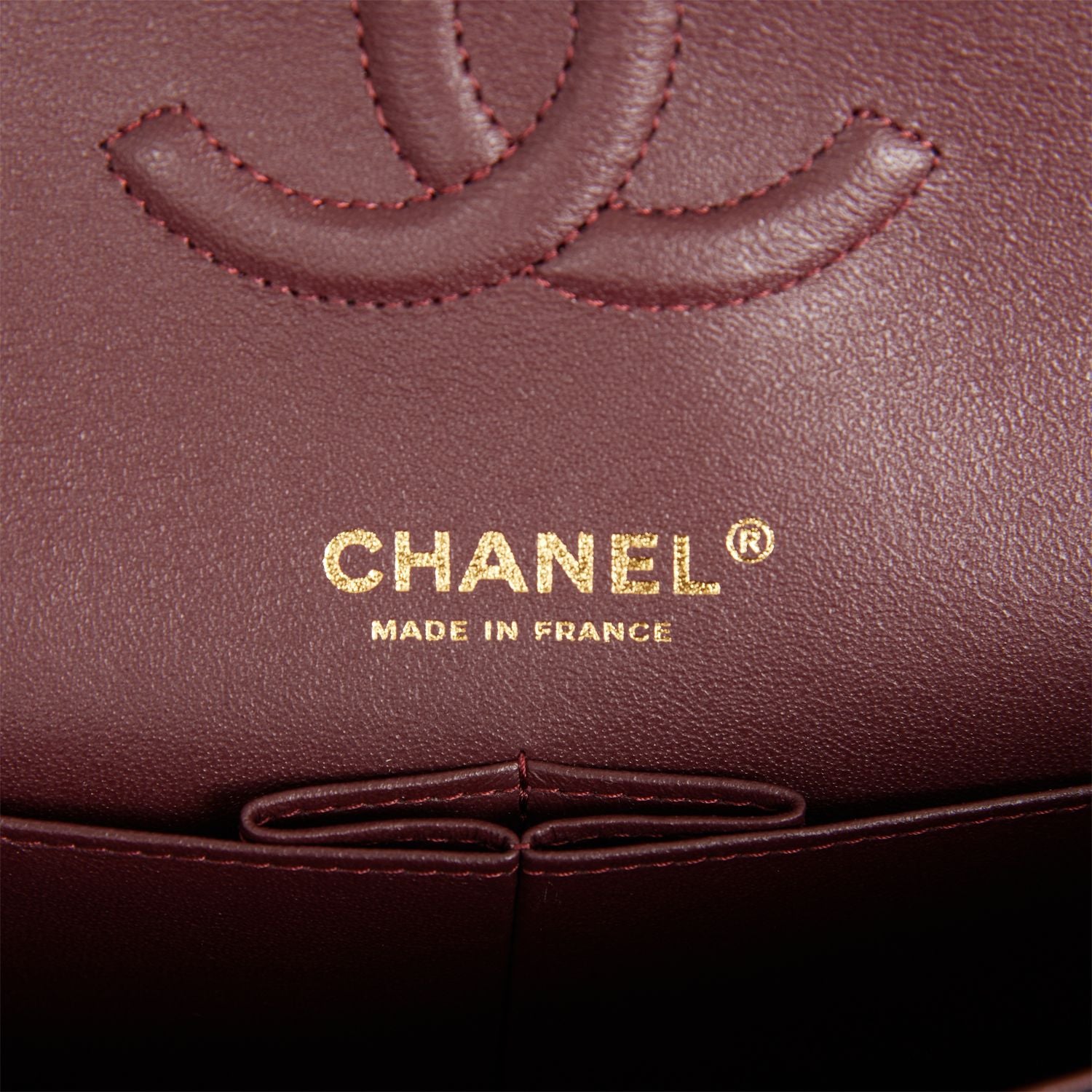The interior is lined in burgundy leather with the “love letter” zipper compartment underneath the first flap, an “outer” slit pocket under the second flap, and an interior compartment with two open pockets separated by a “lipstick” compartment.