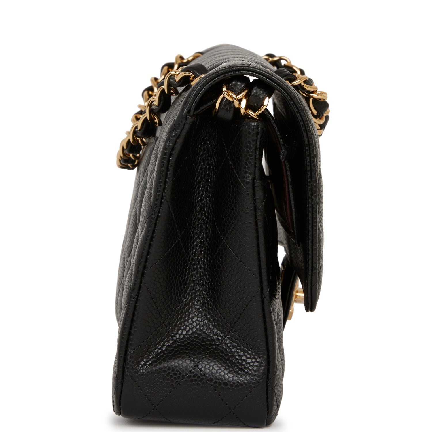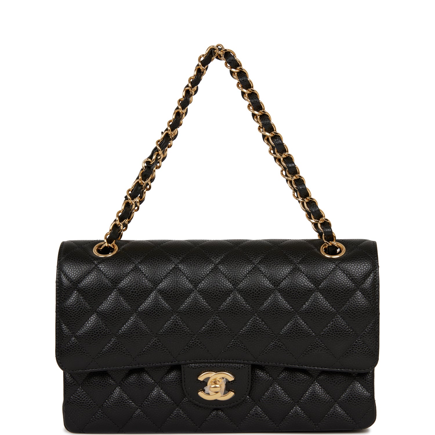 This Medium Classic Double Flap bag is in black caviar leather with gold tone hardware and features a front flap with signature CC turnlock closure, half moon back pocket, and adjustable interwoven gold tone chain link and black leather shoulder strap.