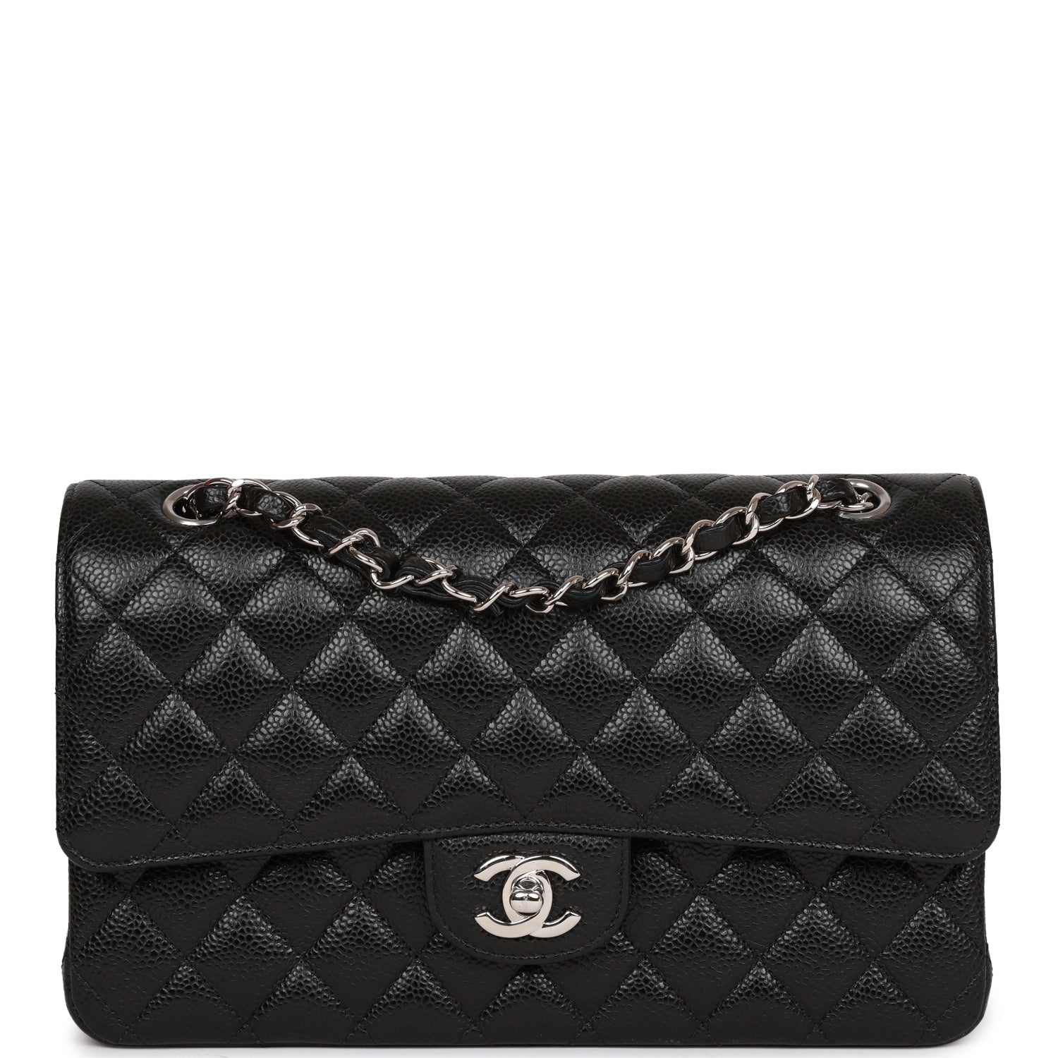 This Medium Classic Double Flap bag is in black caviar leather with silver tone hardware and features a front flap with signature CC turnlock closure, half moon back pocket, and adjustable interwoven silver tone chain link and black leather shoulder strap.