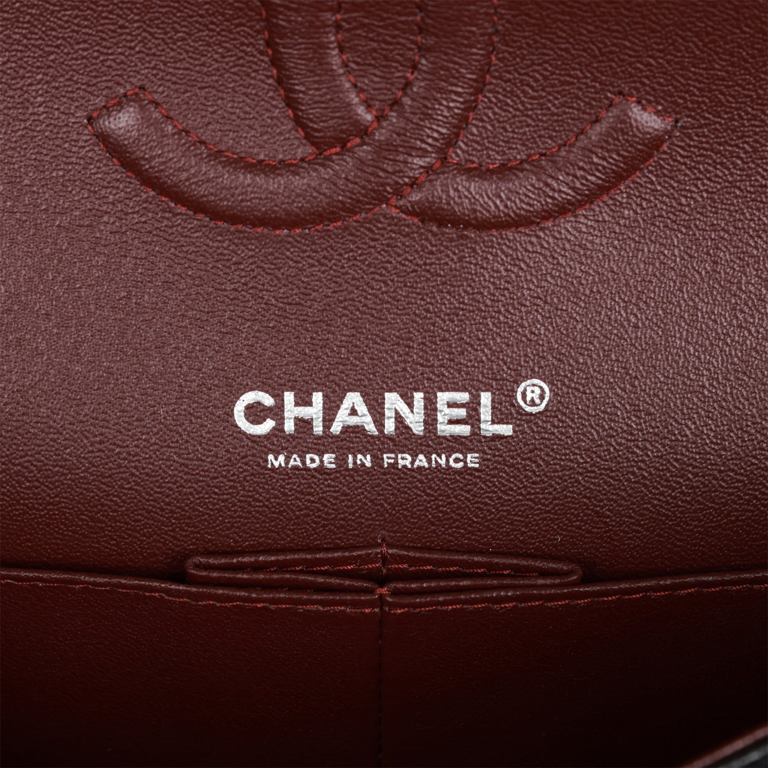 The interior is lined in burgundy leather with the “love letter” zipper compartment underneath the first flap, an “outer” slit pocket under the second flap, and an interior compartment with two open pockets separated by a “lipstick” compartment.