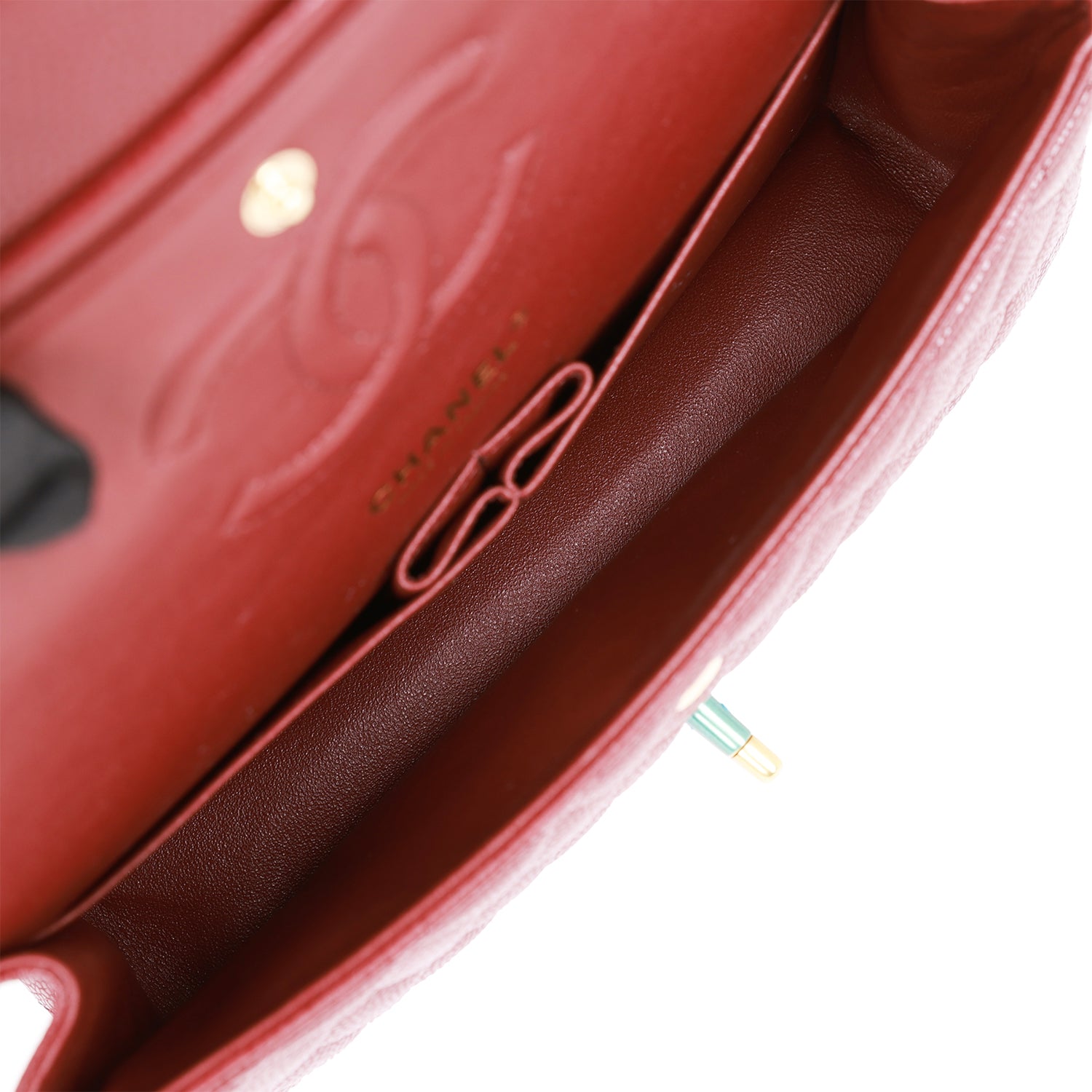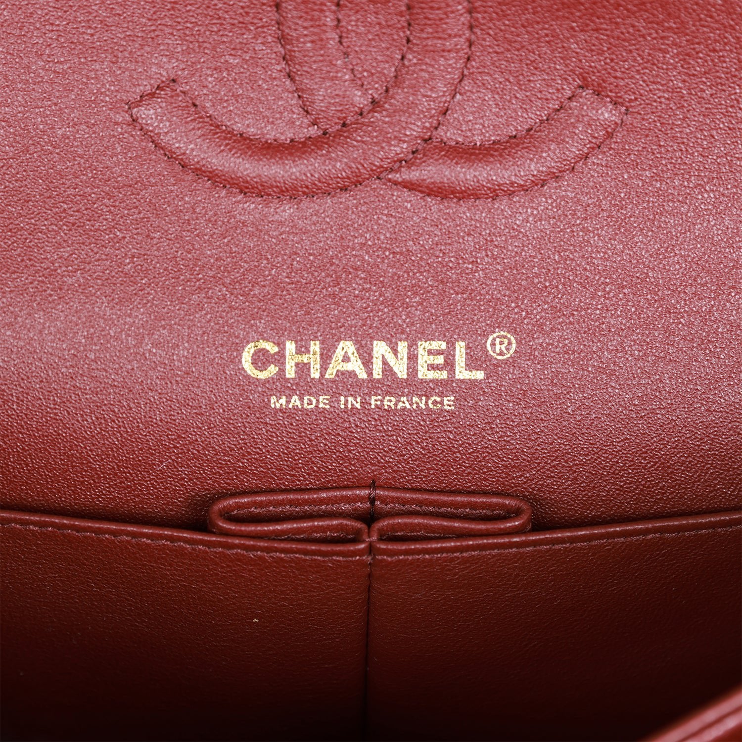 The interior is lined in burgundy leather with the “love letter” zipper compartment underneath the first flap, an “outer” slit pocket under the second flap, and an interior compartment with two open pockets separated by a “lipstick” compartment.