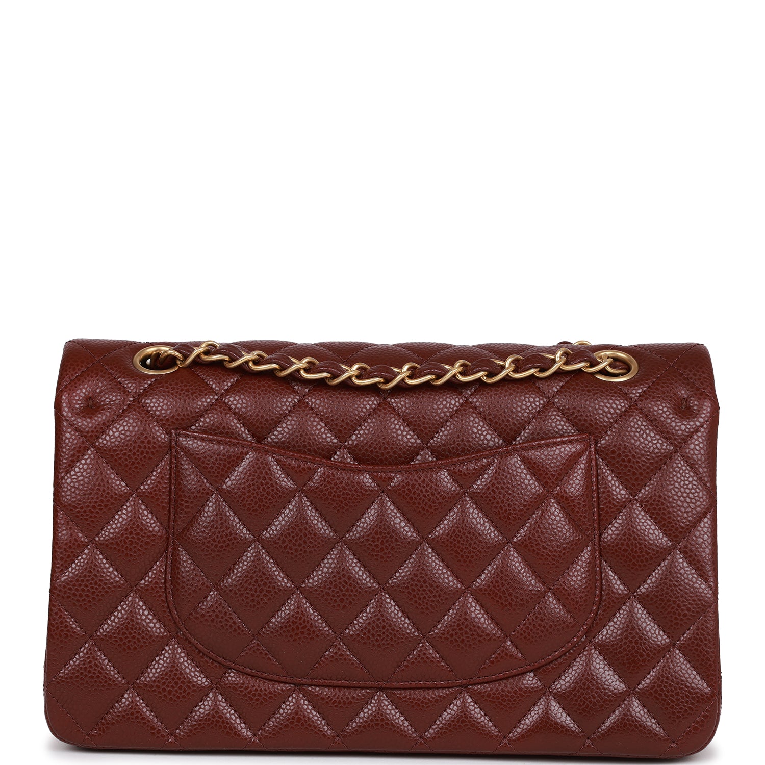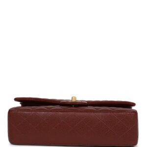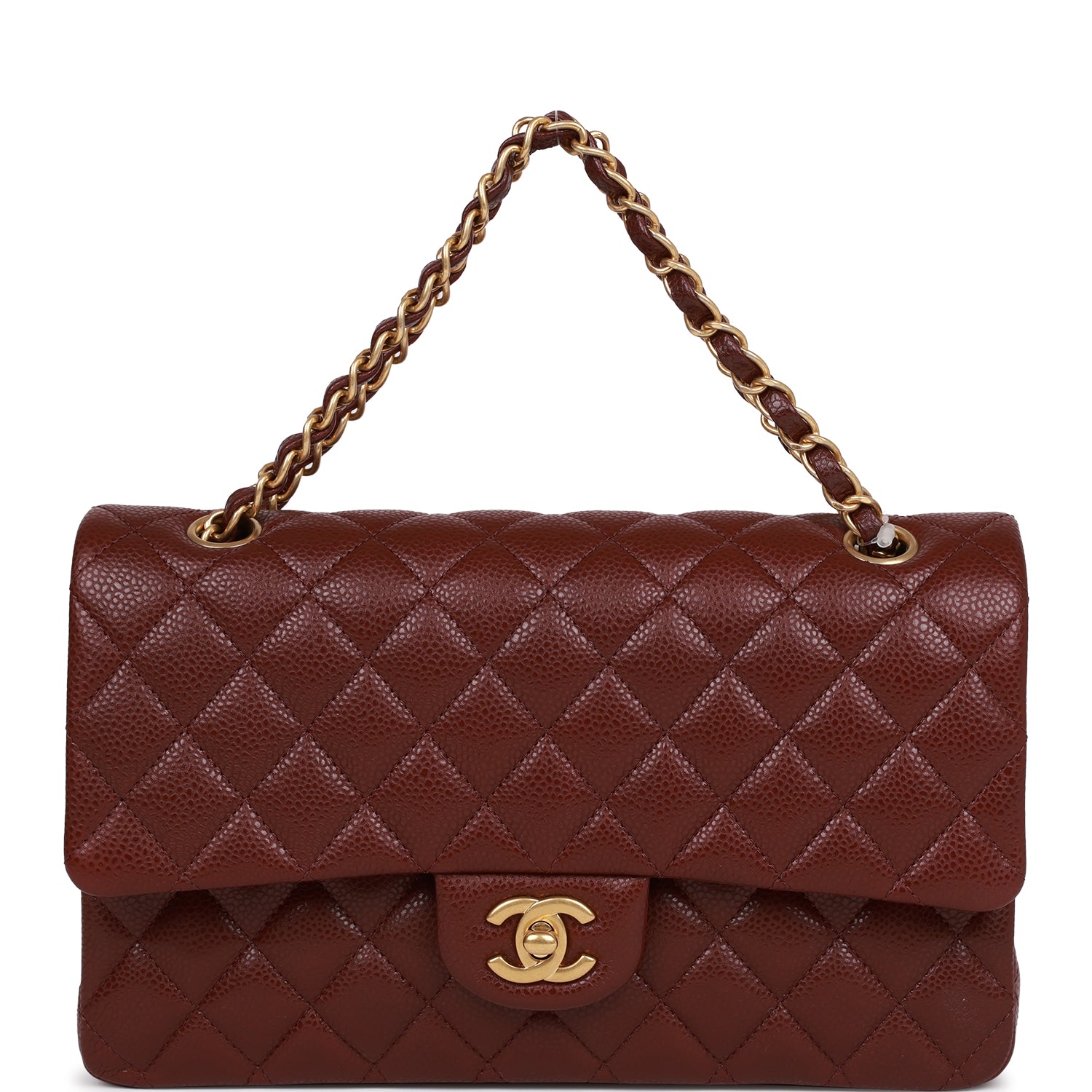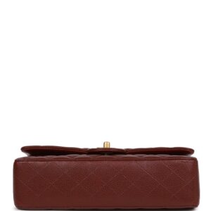 This Medium Classic Double Flap bag is in burgundy caviar leather with antique gold tone hardware and features a front flap with signature CC turnlock closure, half moon back pocket, and adjustable interwoven antique gold tone chain link and burgundy leather shoulder strap.