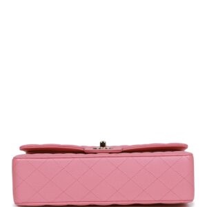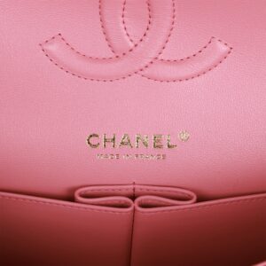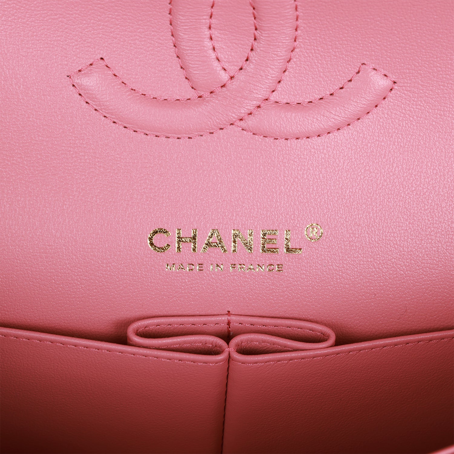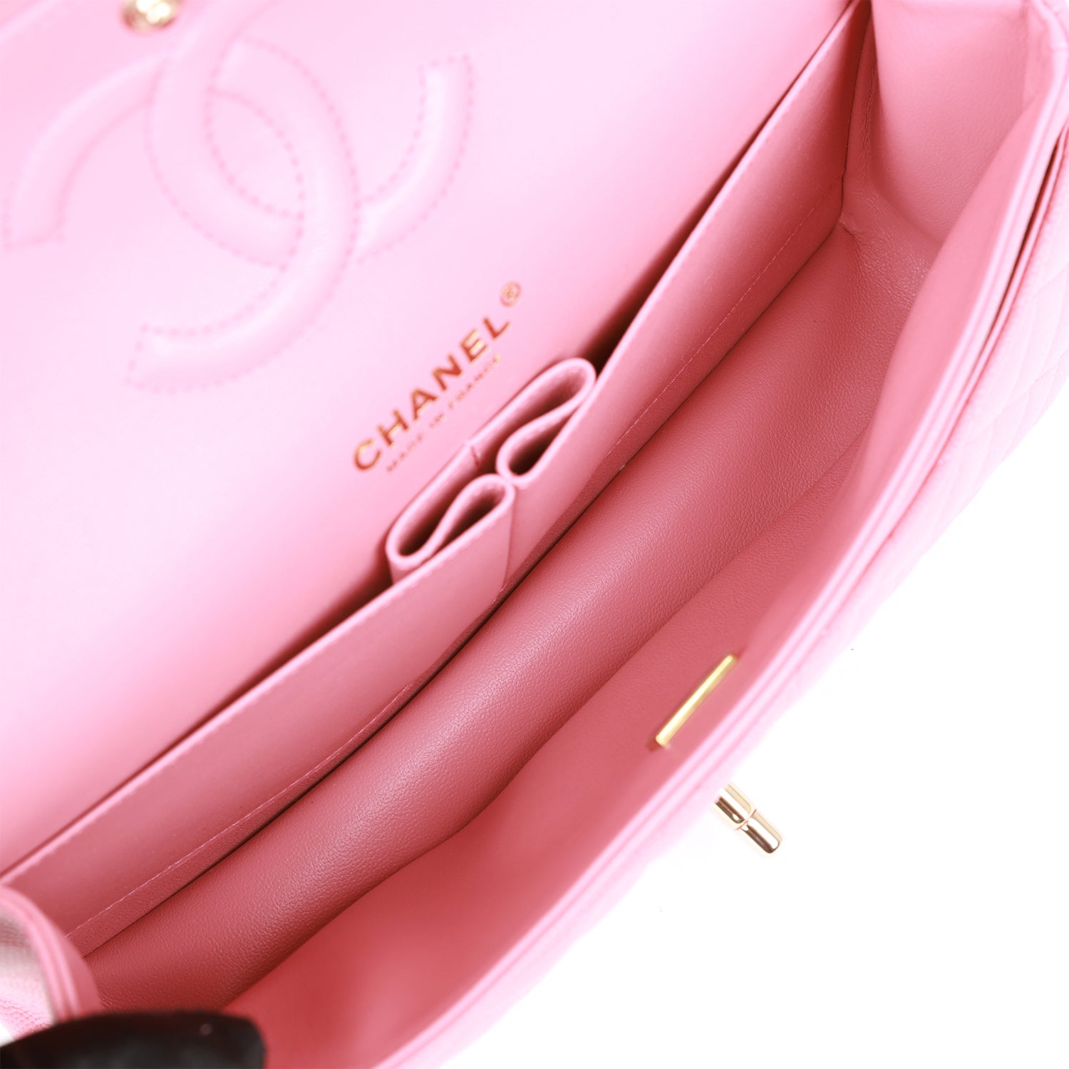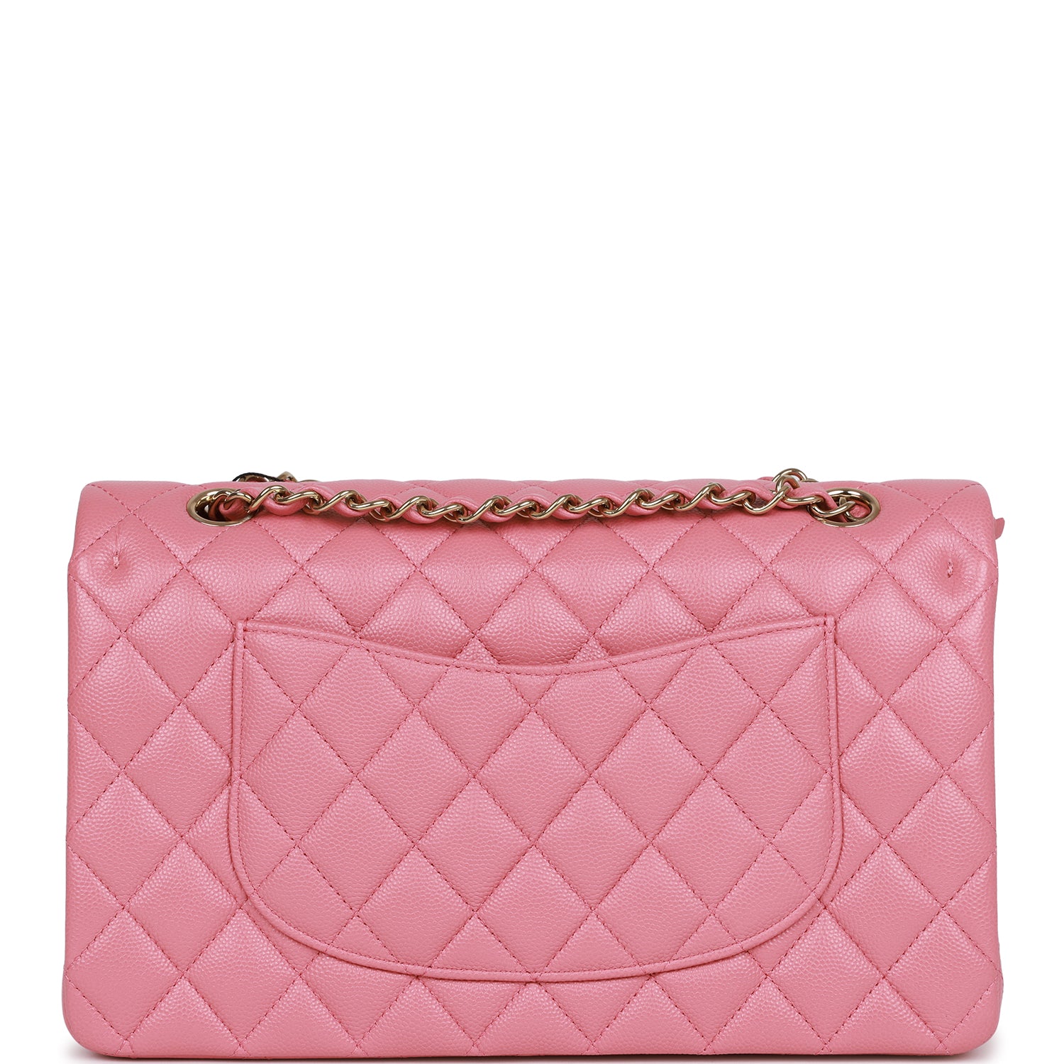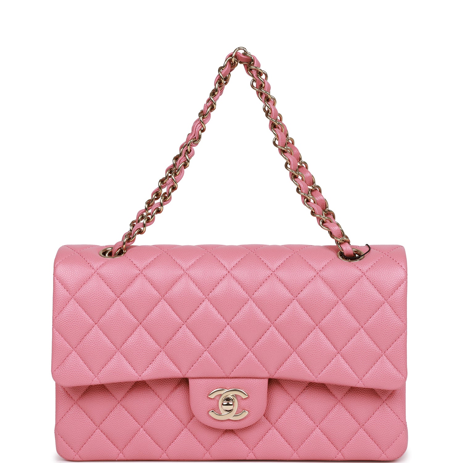 This Medium Classic Double Flap bag is in dark pink caviar leather with light gold tone hardware and features a front flap with signature CC turnlock closure, half moon back pocket, and adjustable interwoven light gold tone chain link and dark pink leather shoulder strap.