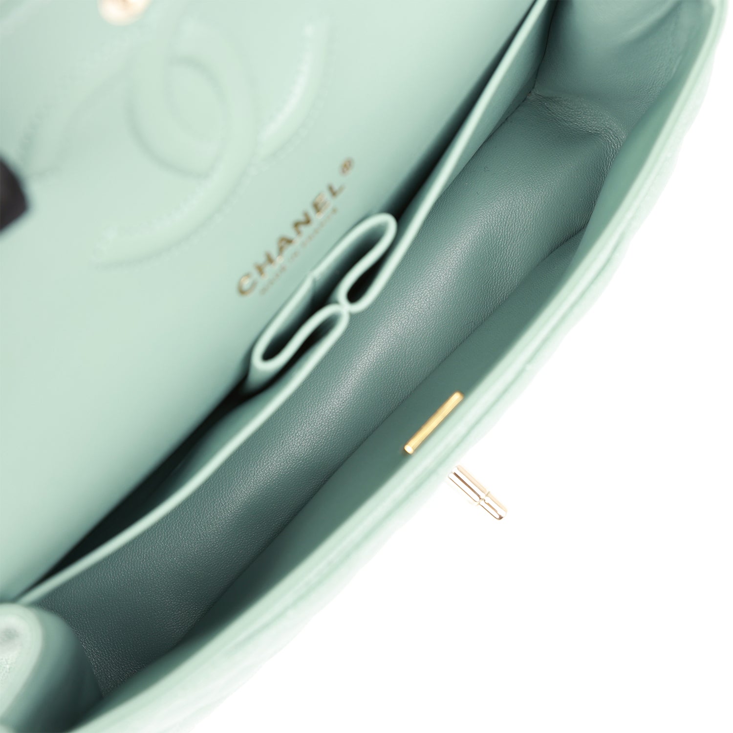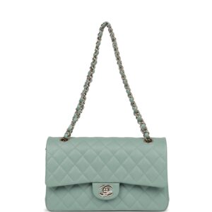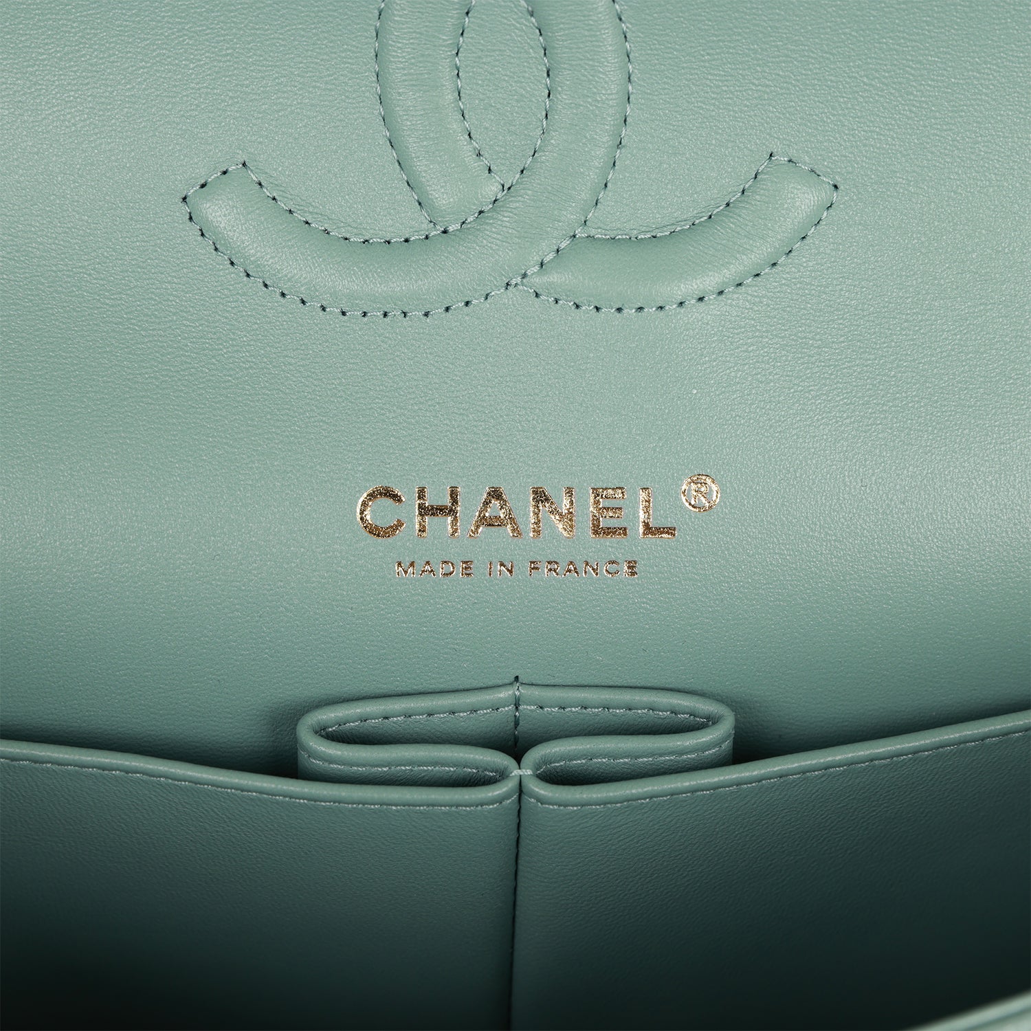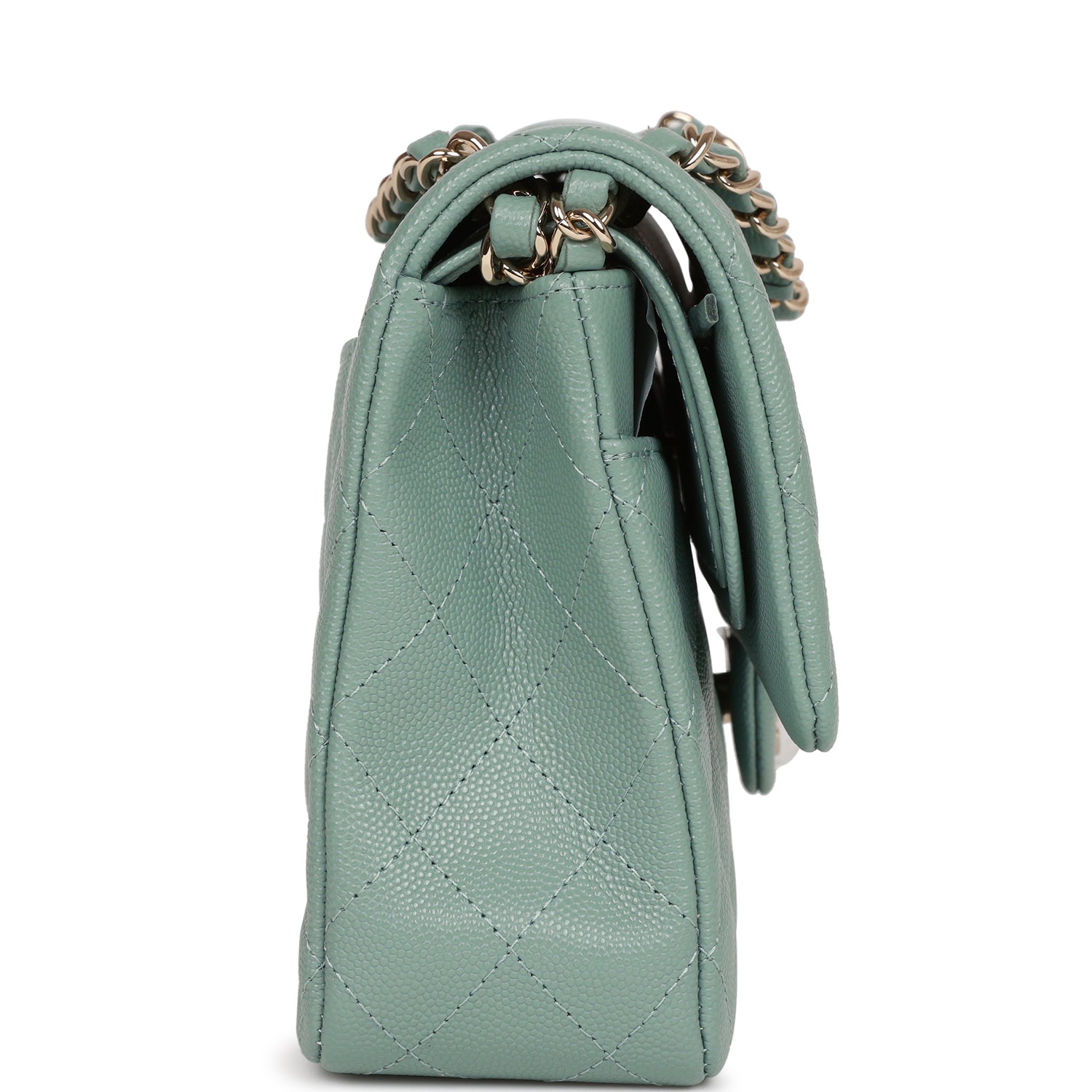 This Medium Classic Double Flap bag is in green caviar leather with light gold tone hardware and features a front flap with signature CC turnlock closure, half moon back pocket, and adjustable interwoven light gold tone chain link and green leather shoulder strap.