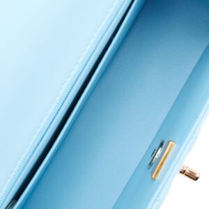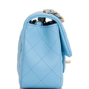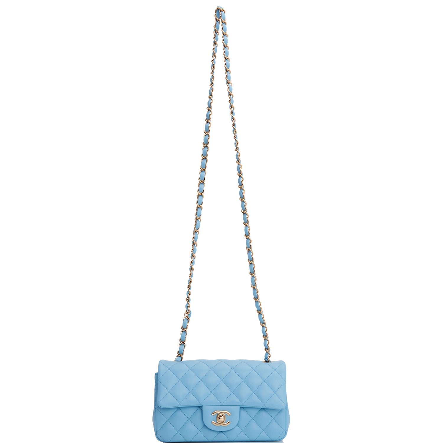 This Mini Rectangular flap bag is of blue lambskin leather with light gold tone hardware and has a front flap with signature CC turnlock closure, rear half moon pocket, single interwoven blue leather and light gold tone chain link shoulder/crossbody strap.