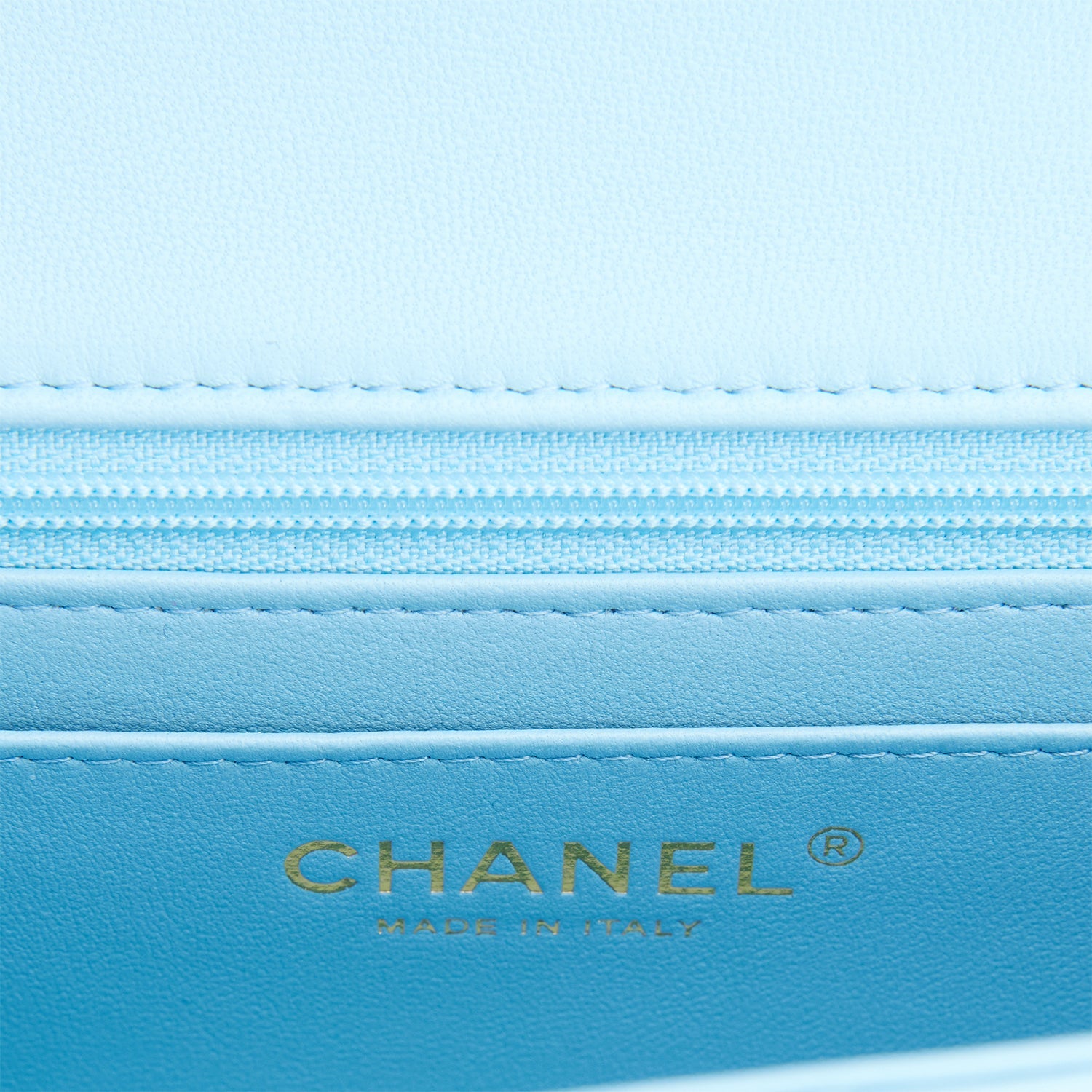 The interior is lined in blue leather and features a zipper pocket with Chanel pull and an open pocket below.