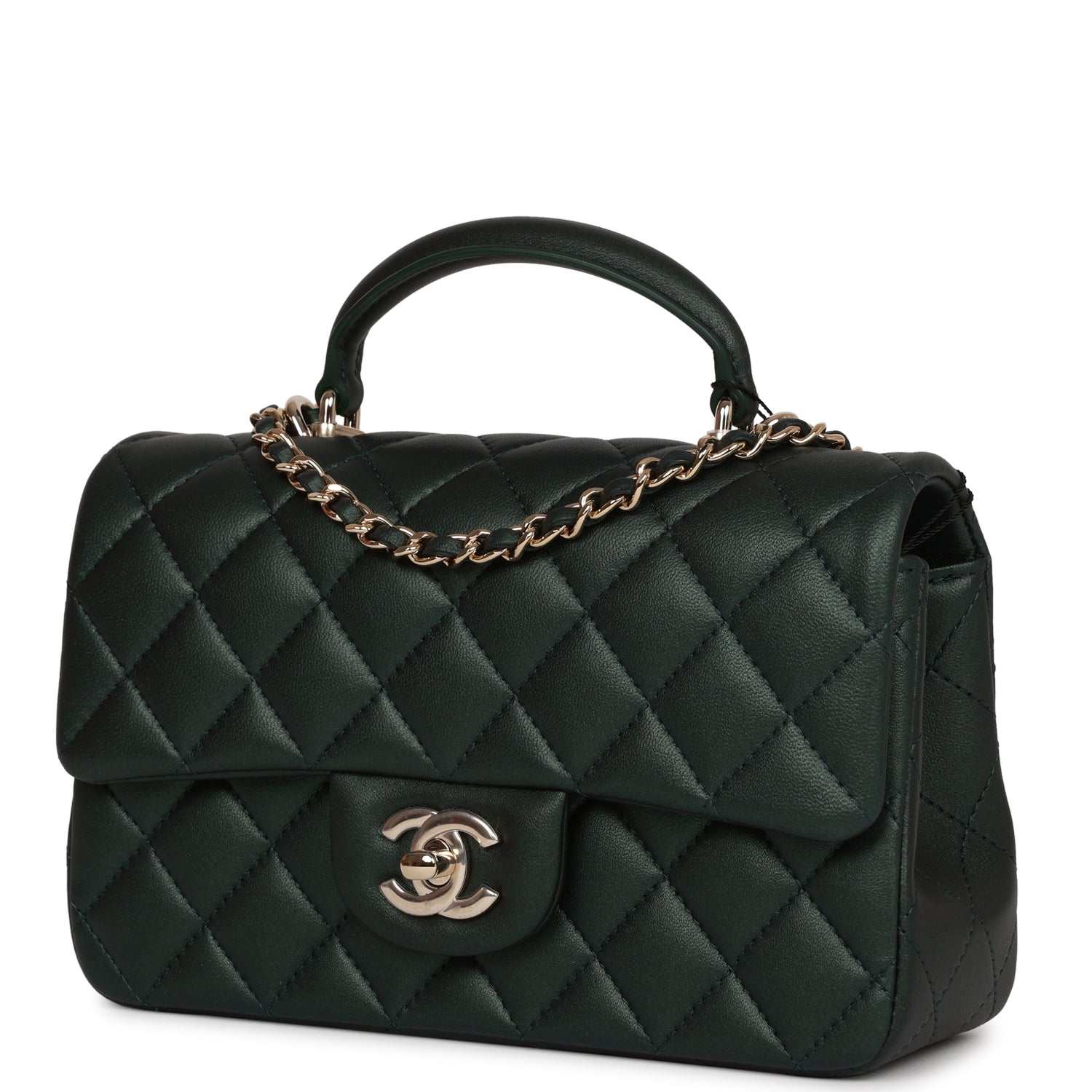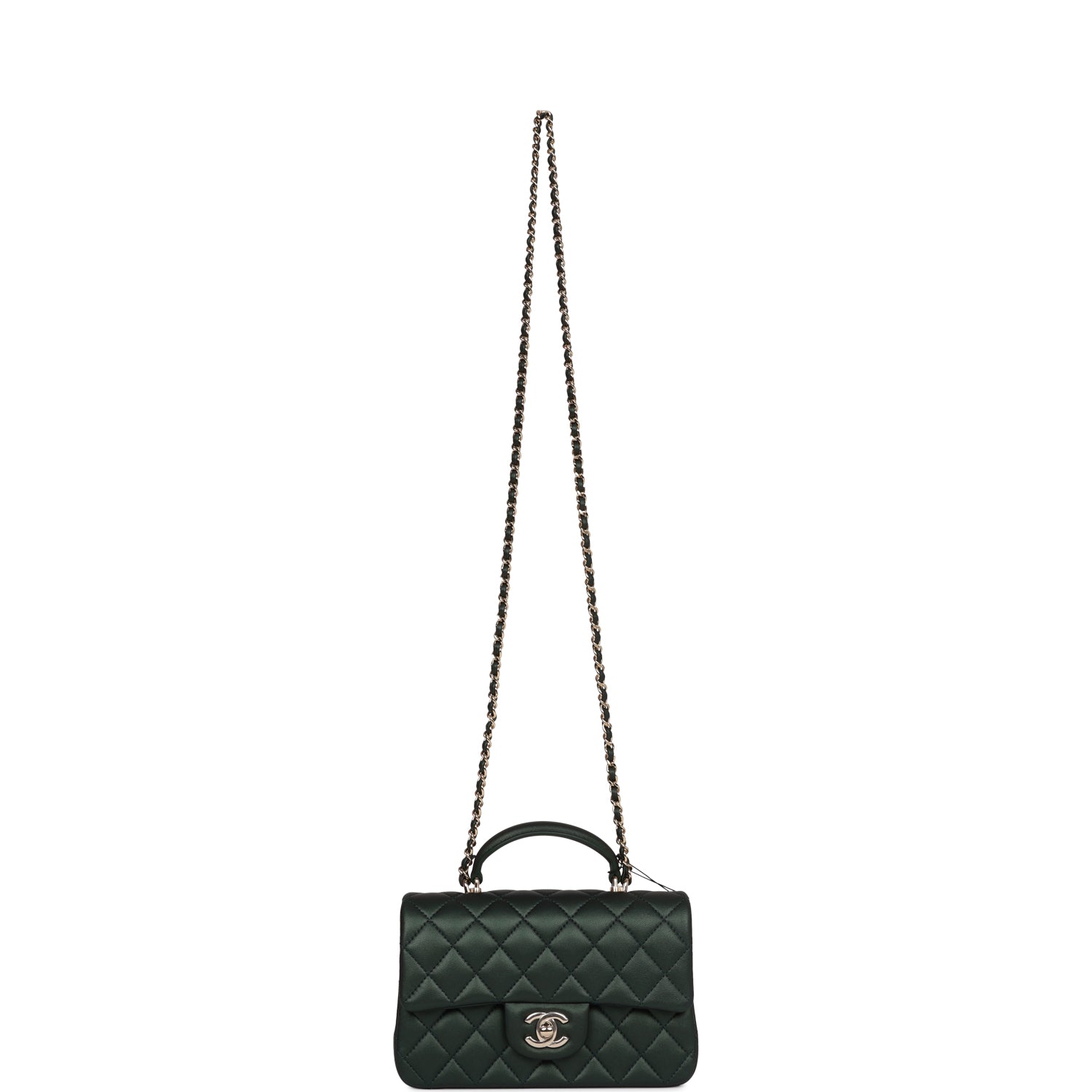 Home Chanel Chanel Classic Bags Chanel Mini Rectangular Flap with Top Handle Dark Green Lambskin Light Gold Hardware