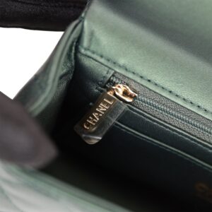 The interior is lined in dark green leather and features a zipper pocket with Chanel pull and an open pocket below.
