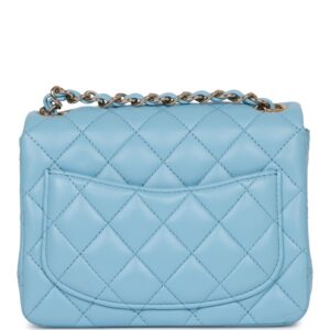 This Mini Square flap bag is in blue lambskin with light gold tone hardware and has a front flap with signature CC turnlock closure, rear half moon pocket and single interwoven blue leather and light gold tone chain link shoulder/crossbody strap.