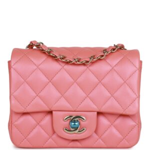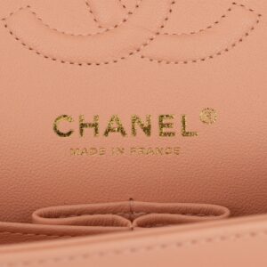 This Small Classic Double Flap bag is in peach lambskin leather with light gold tone hardware and features a front flap with signature CC turnlock closure, half moon back pocket, and adjustable interwoven light gold tone chain link and peach leather shoulder strap.