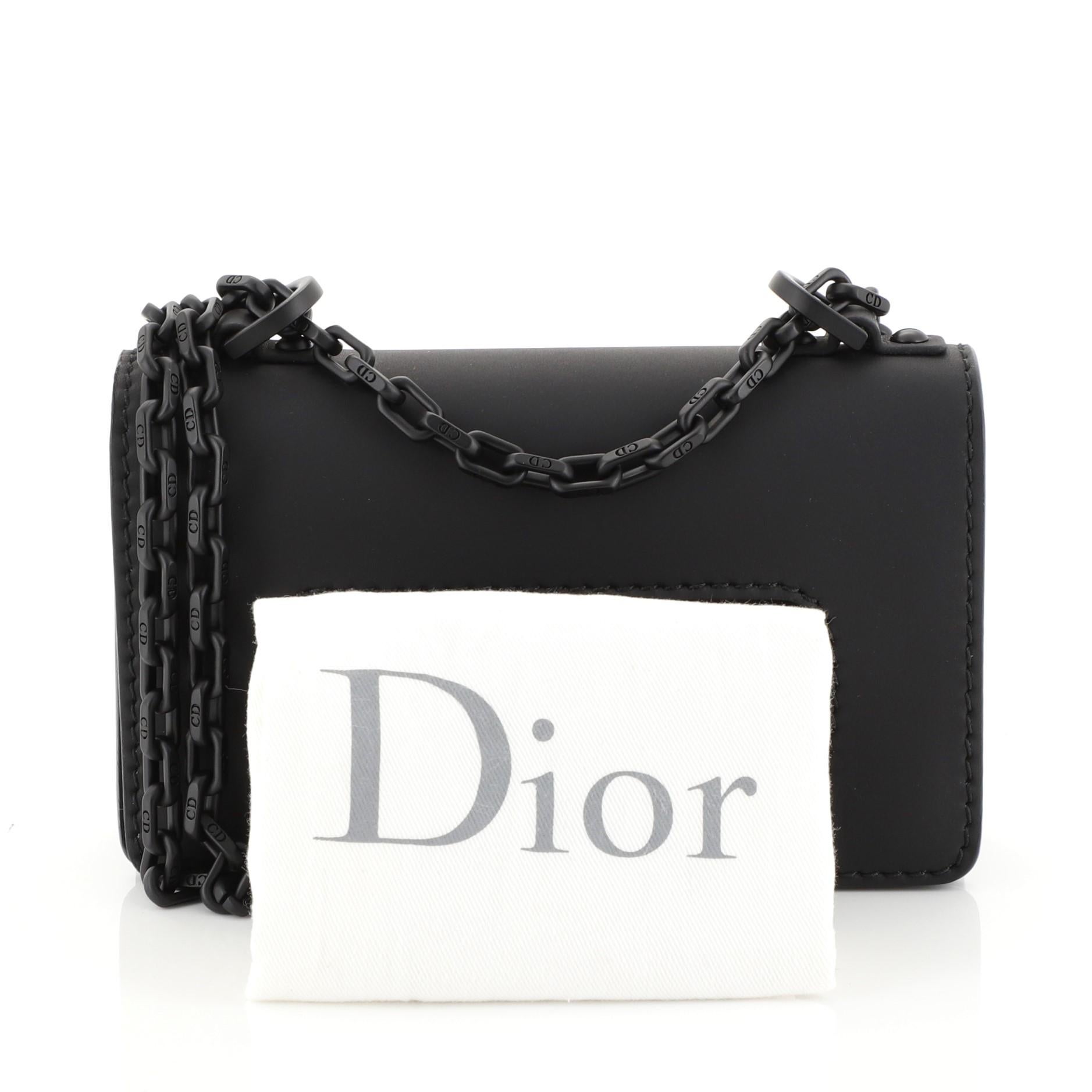 This Christian Dior Ultra Matte J’adior Flap Bag Matte Calfskin Mini, crafted from black calfskin leather, features a chain link strap, slot handclasp, and matte black-tone hardware. Its flap opens to a black microfiber interior with a slip pocket.