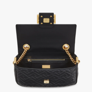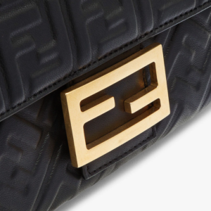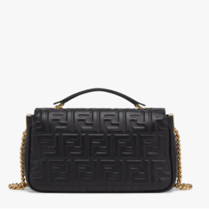 Iconic medium Baguette bag with chain, made of black soft nappa leather with a 3D texture FF motif. Decorated with an FF clasp.