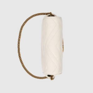 The GG Marmont mini bag in white matelassé leather is defined by its softly structured shape and a flap closure. The Double G defines the line, a three-dimensional detail inspired by an archival design from the ’70s.