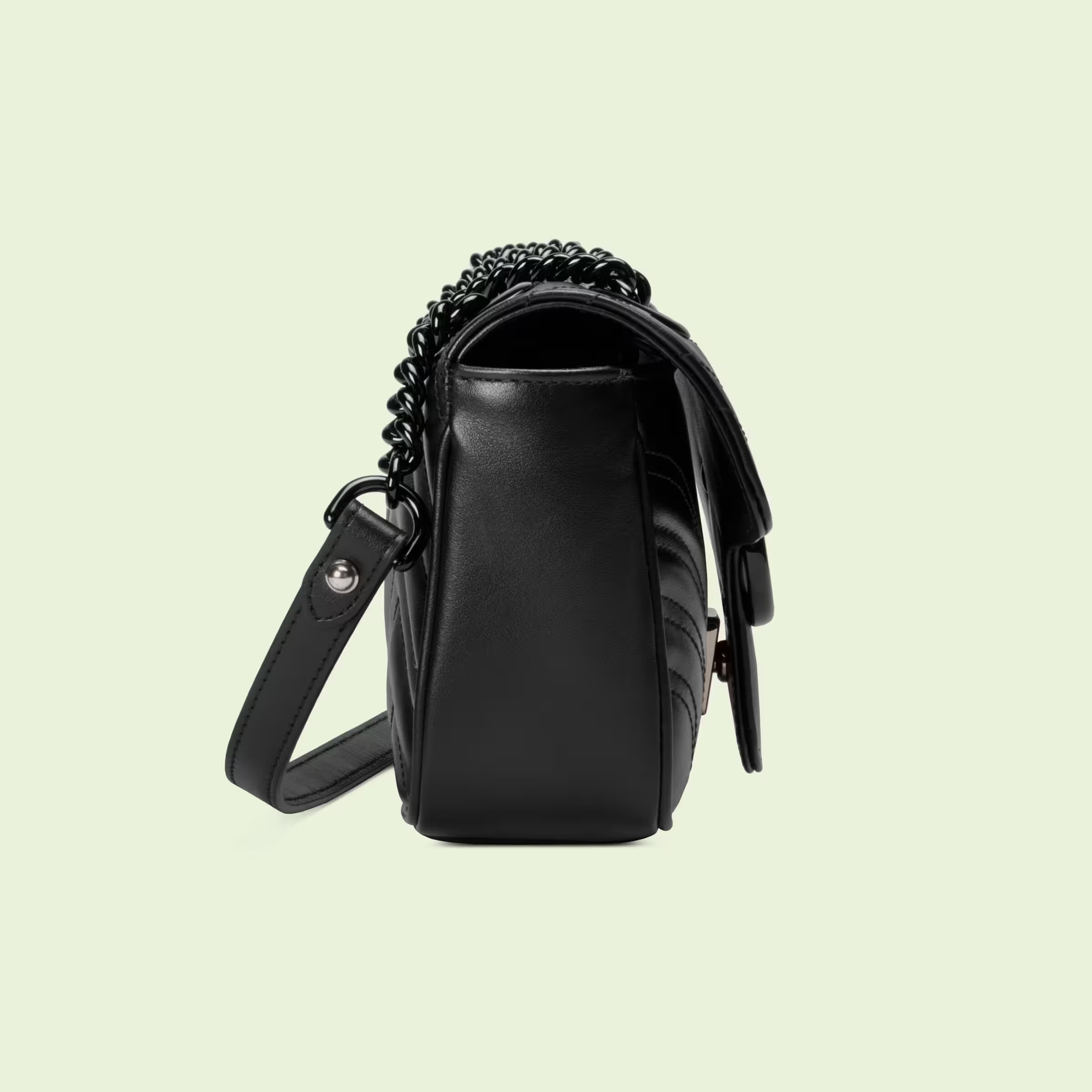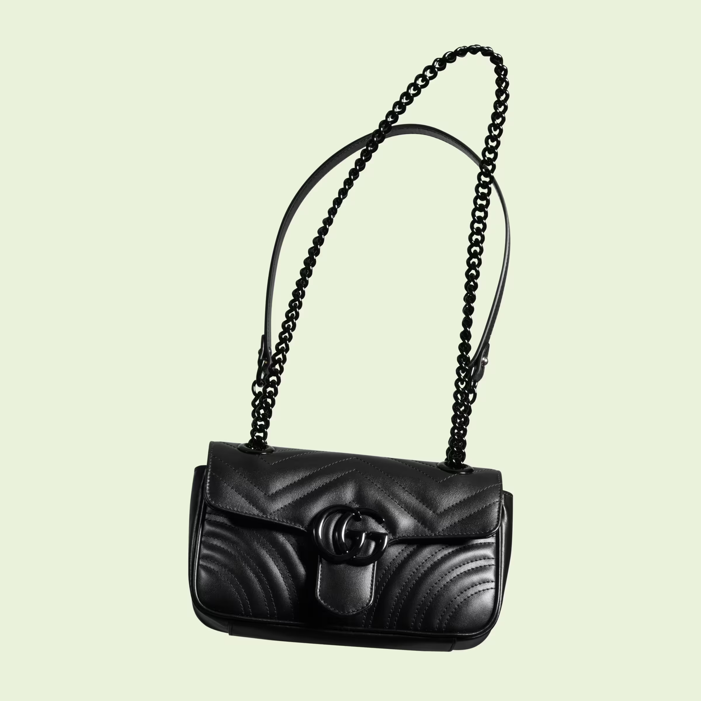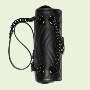 The mini GG Marmont chain shoulder bag has a softly structured shape and an oversized flap closure with Double G hardware. The sliding chain strap can be worn multiple ways, changing between a shoulder and a top handle bag. Made in matelassé chevron leather, the accessory is introduced for Gucci Love Parade with monochrome hardware.