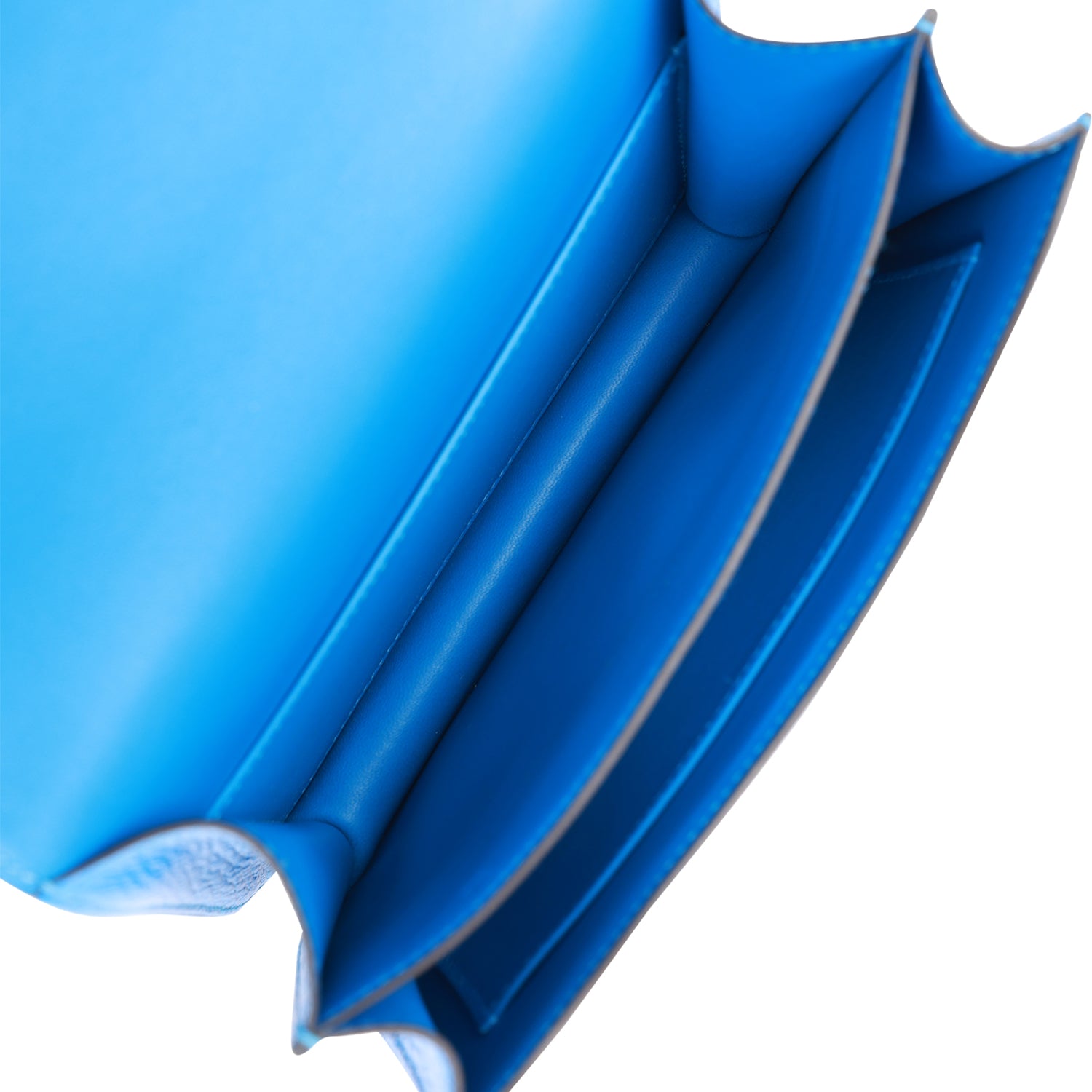 The interior is lined with Bleu Hydra lambskin and has an open pocket on the front wall, a center divide, and a slit pocket on the back wall.