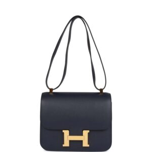 This Constance is in Bleu Nuit evercolor leather with gold hardware and has tonal stitching, a metal “H” snap lock closure, and adjustable shoulder strap.