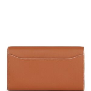This Constance Wallet To Go is in gold epsom leather with gold hardware and has contrast stitching, metal “H” snap lock closure, open front compartment and removable crossbody strap.