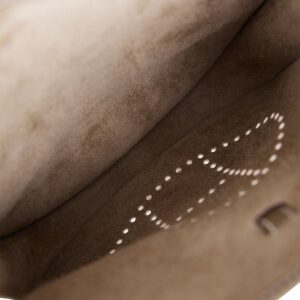 This Evelyne is in Etoupe clemence leather with gold hardware and has contrast stitching, pull tab top closure and Etoupe removable canvas and leather shoulder/crossbody strap.