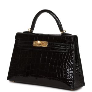This tiny Kelly, in the Sellier style, is in Black shiny Mississippiensis alligator with gold hardware and has tonal stitching, two front straps with front toggle closure, single rolled handle and removable shoulder strap.