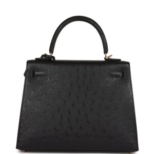 This Kelly, in the Sellier style, is in black ostrich with gold hardware and has tonal stitching, two straps with front toggle closure, clochette with lock and two keys, single rolled handle and removable shoulder strap.