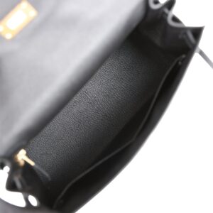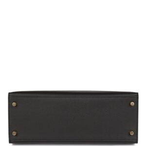 This Kelly Sellier is of black epsom leather with gold hardware and has tonal stitching, a front toggle closure, a clochette with lock and two keys, a single rolled handle and an optional shoulder strap.