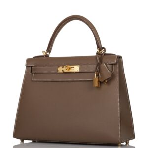 This Kelly, in the Sellier style, is in Etoupe epsom leather with gold hardware and has contrast stitching, front flap, two straps with center toggle closure, clochette with lock and two keys a single rolled handle and removable shoulder strap.