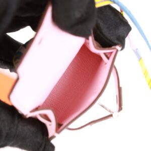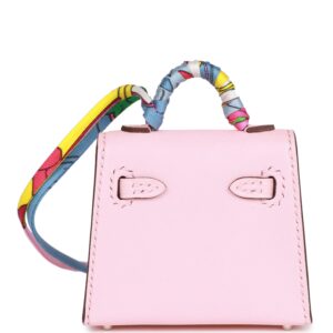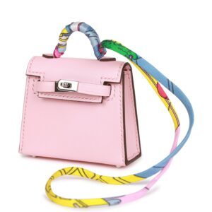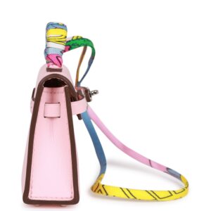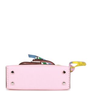 This Mini Kelly Twilly Bag Charm is of Rose Sakura tadelakt leather with palladium hardware and has a front flap that opens, silk twilly wrapped handle and matching decorative strap.