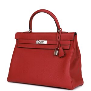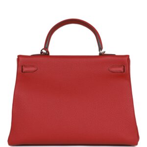 This Special Order Kelly, in the Retourne style, is in Rouge Grenat togo leather with palladium hardware and has tonal stitching, two straps with front toggle closure, clochette with lock and two keys, single rolled handle and removable shoulder strap.