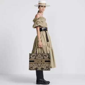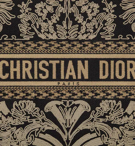 Introduced by Maria Grazia Chiuri, Dior’s Creative Director, the Dior Book Tote has become a staple of the Dior aesthetic. Designed to hold all the daily essentials, the style is fully embroidered in a black and beige Ornamental motif with a Cornely effect, inspired by Andalusian baroque in a graphic spirit. The design is adorned with the ‘CHRISTIAN DIOR PARIS’ signature on the front and exemplifies the House’s signature savoir-faire. The large tote may be carried by hand or worn over the shoulder.