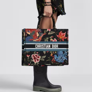 Introduced by Maria Grazia Chiuri, Creative Director of Christian Dior, the Dior Book Tote has become a staple of the Dior aesthetic. Designed to hold all the daily essentials, the style is fully embroidered with a bucolic black multicolor Dior Birds motif, inspired by the Japonisme art movement and featuring birds surrounded by floral decor. Adorned with the Christian Dior Paris signature on the front, the large tote exemplifies the House’s signature savoir-faire and may be carried by hand or worn over the shoulder.