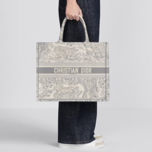 Introduced by Maria Grazia Chiuri, Creative Director of Christian Dior, the Dior Book Tote has become a staple of the Dior aesthetic. Designed to hold all the daily essentials, the style is fully embroidered with a gray Toile de Jouy motif. Adorned with the ‘CHRISTIAN DIOR PARIS’ signature on the front, the large tote exemplifies the House’s signature savoir-faire and may be carried by hand or worn over the shoulder.