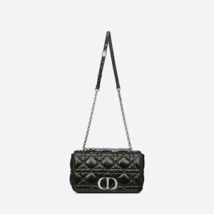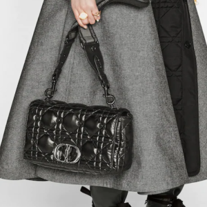 The Dior Caro bag combines modernity with timeless elegance. The design is crafted in black calfskin and is distinguished by its original quilted-effect Macrocannage stitching. The bag features a flap adorned with a ruthenium ‘CD’ twist clasp, inspired by the seal of a Christian Dior perfume bottle. The detachable chain shoulder strap with ‘CD’ signature links allows the large bag to be carried by hand or worn over the shoulder and may be replaced by one of the House’s wide embroidered straps for day or evening attire.