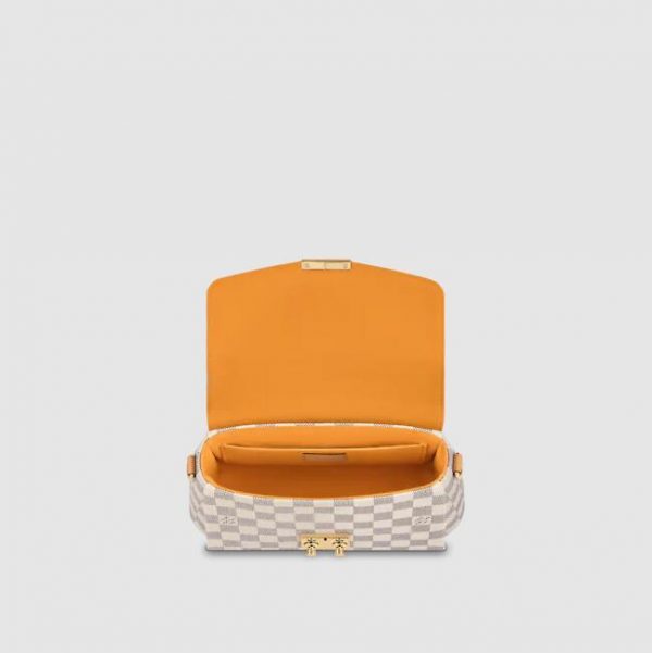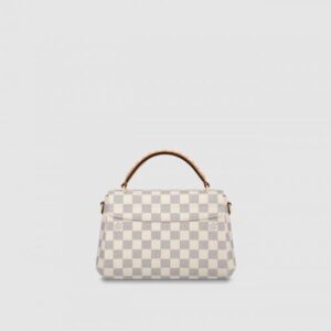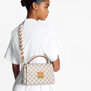 A compact bag with a modern shape, the Croisette hand bag is made from Damier Azur canvas and features a two-tone, hand-braided leather shoulder strap for a summery touch of color. Designed to fit all essentials plus a wallet, this stylish bag can be carried by hand, on the shoulder or crossbody.