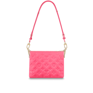 The Coussin BB is part of the LV Rose Fluo capsule collection by Nicolas Ghesquière. It is finished in eye-catching fluorescent pink calf leather embossed with a Monogram pattern. A chunky gold-colored chain and pink leather shoulder strap complement