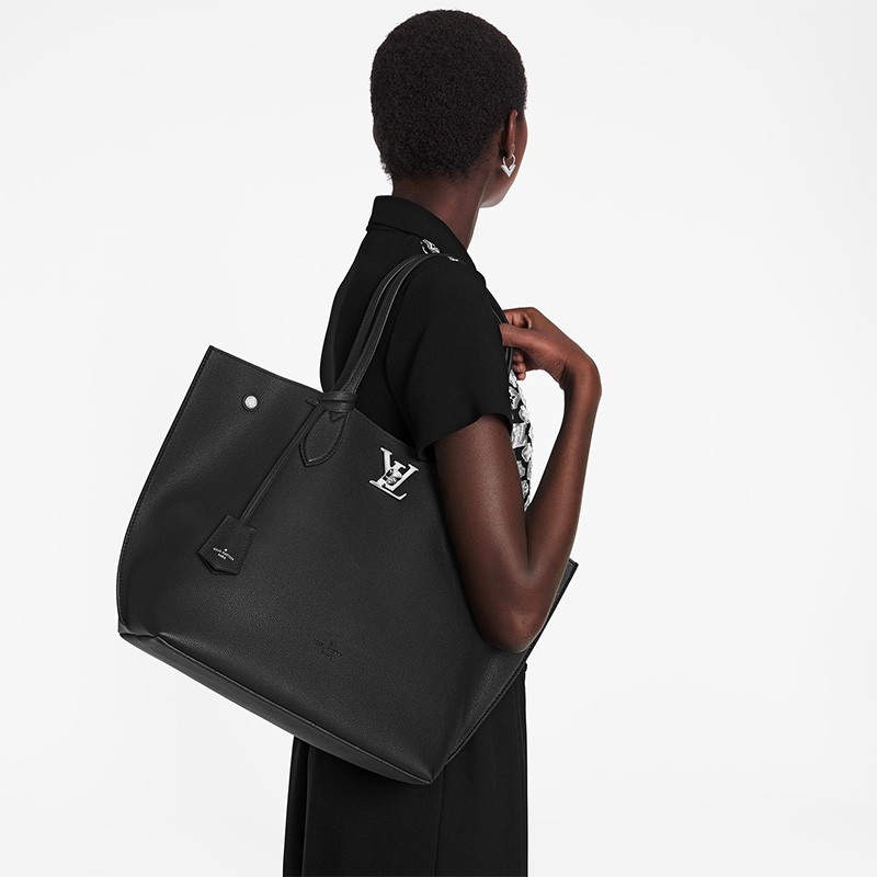 Dedicated to the elegant, active woman, this Lockme Go tote offers both flawless functionality and uncompromising style. Crafted from soft, grained calfskin, with double handles designed for comfortable over-the-shoulder wear, this essential modern carry-all is accented with a silvery LV turn lock and two snap buttons to keep belongings secure.