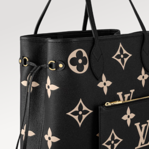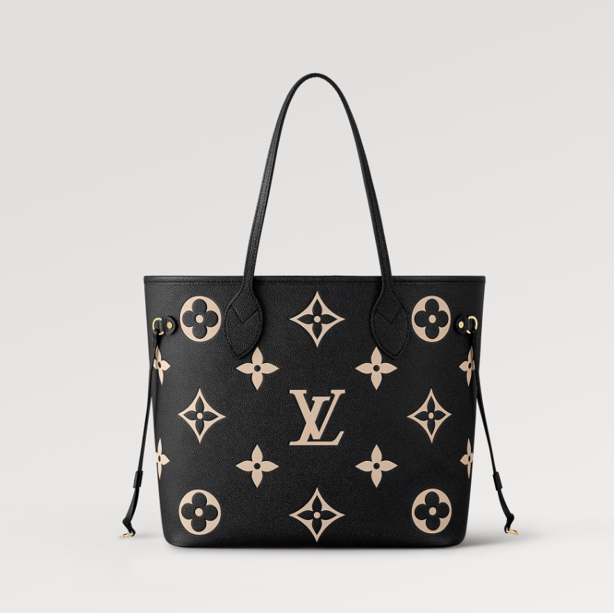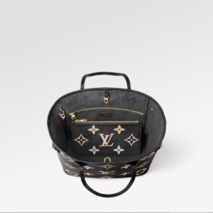Ideal for everyday use, the roomy Neverfull MM tote bag is made from black cowhide leather with the Monogram pattern embossed then printed in beige on the leather. Cinch the side laces and this tote transforms into an elegant city bag. It can be carried on the shoulder or the elbow, thanks to the long shoulder handles.