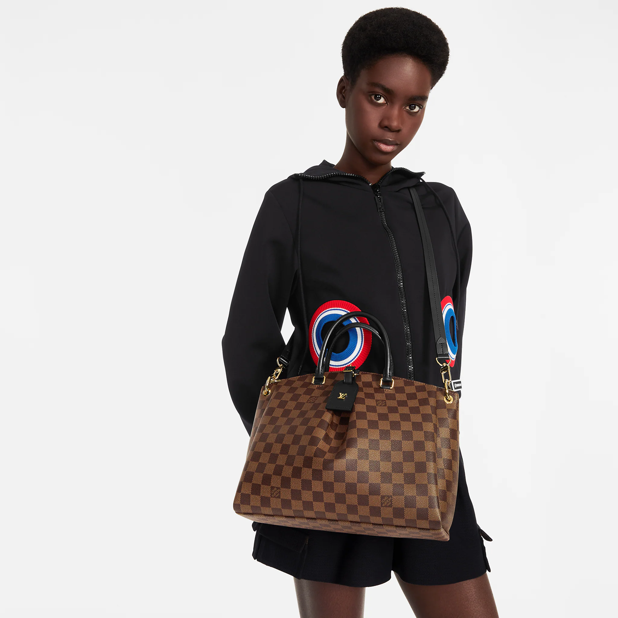 Fashioned from Damier Ebène canvas and lined in black fabric, the Odeon Tote MM handbag is for those looking for a spacious and easy-to-wear carryall. The gold-color side rings and eyelets, as well as the metallic LV signature on the leather luggage tag, make this bag instantly recognizable.
