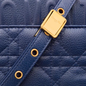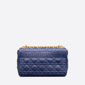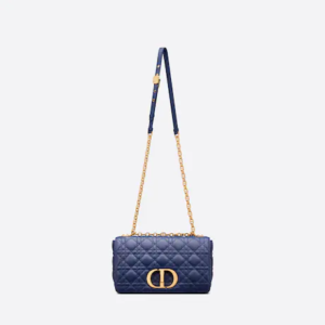 The Dior Caro bag combines modernity with timeless elegance. The silhouette is crafted in royal blue calfskin with Cannage topstitching. The supple bag features a flap adorned with an antique gold-finish metal ‘CD’ twist clasp, inspired by the seal of a Christian Dior perfume bottle. The detachable chain shoulder strap with ‘CD’ signature links allows the medium bag to be carried by hand or worn over the shoulder and may be replaced by one of the House’s wide embroidered straps for day or evening attire.