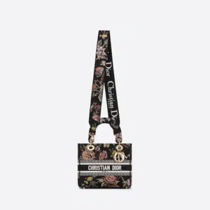 The Lady D-Lite bag combines classic elegance with House modernity. Fully embroidered with the black multicolor Dior Jardin Botanique motif, it features a romantic floral pattern inspired by the Granville gardens so dear to Mr. Dior. The front features a ‘CHRISTIAN DIOR PARIS’ signature while the ‘D.I.O.R.’ charms in pale gold-finish metal embellish and illuminate the silhouette. Equipped with a wide, reversible and removable embroidered shoulder strap, the medium Lady D-Lite bag can be carried by hand or worn crossbody.