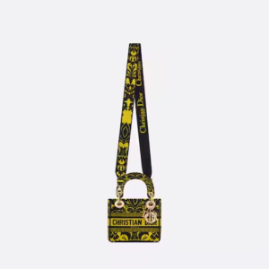 The Lady D-Lite bag combines classic elegance with House modernity. The style is fully embroidered with a yellow multicolor Ornamental motif inspired by Andalusian baroque in a graphic spirit. The front features a ‘CHRISTIAN DIOR PARIS’ signature while the ‘D.I.O.R.’ charms in pale gold-finish metal further enhance the silhouette. Equipped with a wide, reversible and removable embroidered shoulder strap, the miniature Lady D-Lite bag can be carried by hand or worn crossbody.