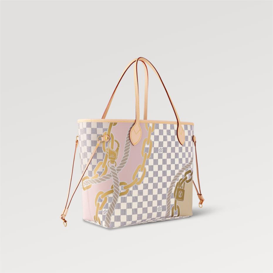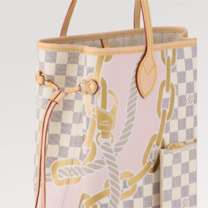 This Neverfull MM tote bag is made from Damier Azur coated canvas customized with a bold five-color nautical print of ropes and chains, bringing a fresh twist to the classic checkerboard pattern. This versatile bag features side laces that can be cinched for a sleeker silhouette or loosened for a more casual look.
