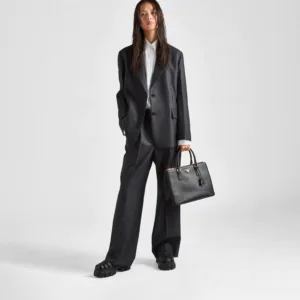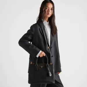 Production of the Prada Galleria bag, composed of 83 pieces, is an authentic fusion between industrial precision and the refined accuracy of craftsmanship that can only be performed by hand. The design is clean and elegant yet innately pragmatic, an aesthetic language blending form and function that combines history and modernity. Originating the definition of “timeless”, the Galleria bag has become a hallmark of Prada’s identity in the twenty-first century. The accessory, presented in the large version, is made of iconic Saffiano, a calf leather patented by Mario Prada that is resistant to scratches and water and defined by its crosshatch texture.