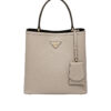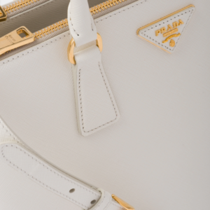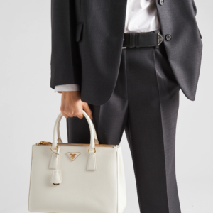 Production of the Prada Galleria bag, composed of 83 pieces, is an authentic fusion between industrial precision and the refined accuracy of craftsmanship that can only be performed by hand. The design is clean and elegant yet innately pragmatic, an aesthetic language blending form and function that combines history and modernity. Originating the definition of “timeless”, the Galleria bag has become a hallmark of Prada’s identity in the twenty-first century. The accessory, presented in the large version, is made of iconic Saffiano, a calf leather patented by Mario Prada that is resistant to scratches and water and defined by its crosshatch texture.