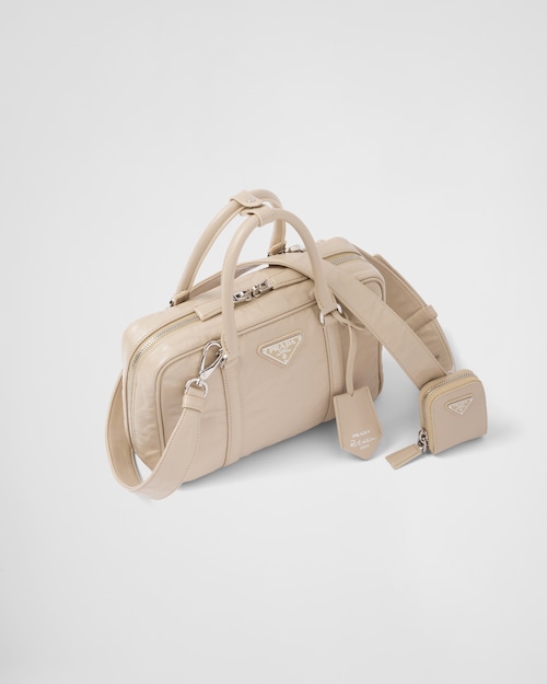 This bag with casual, classic allure is made of glossy nappa leather with a natural finish. The handmade wrinkled effect contrasts with the concept of a rigid construction, reinterpreting an everyday object that can be worn without constraints. Presented for the Spring Summer 2023 collection, the accessory that is a re-edition of a bag presented in 2001 is decorated with the enameled metal triangle logo.