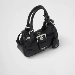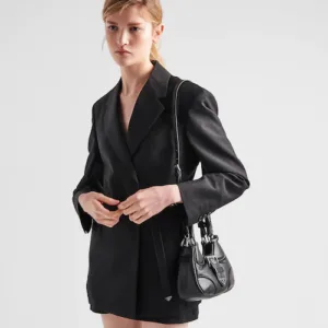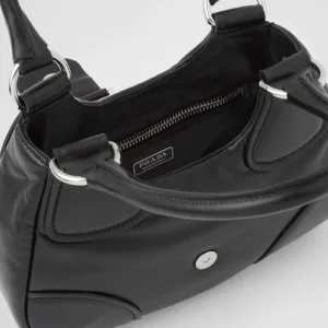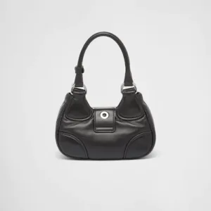 Reimagining the iconic lines of a model from the Prada archives from the 2000s, this nappa leather bag combines traditional elements reinterpreting them in a new way, with an innovative soft design. Softness and simplicity of the silhouette define this hobo bag, embellished by the ton-sur-ton triangle logo that frames the lettering logo, creating a three-dimensional and material game and enriching the design of the accessory.